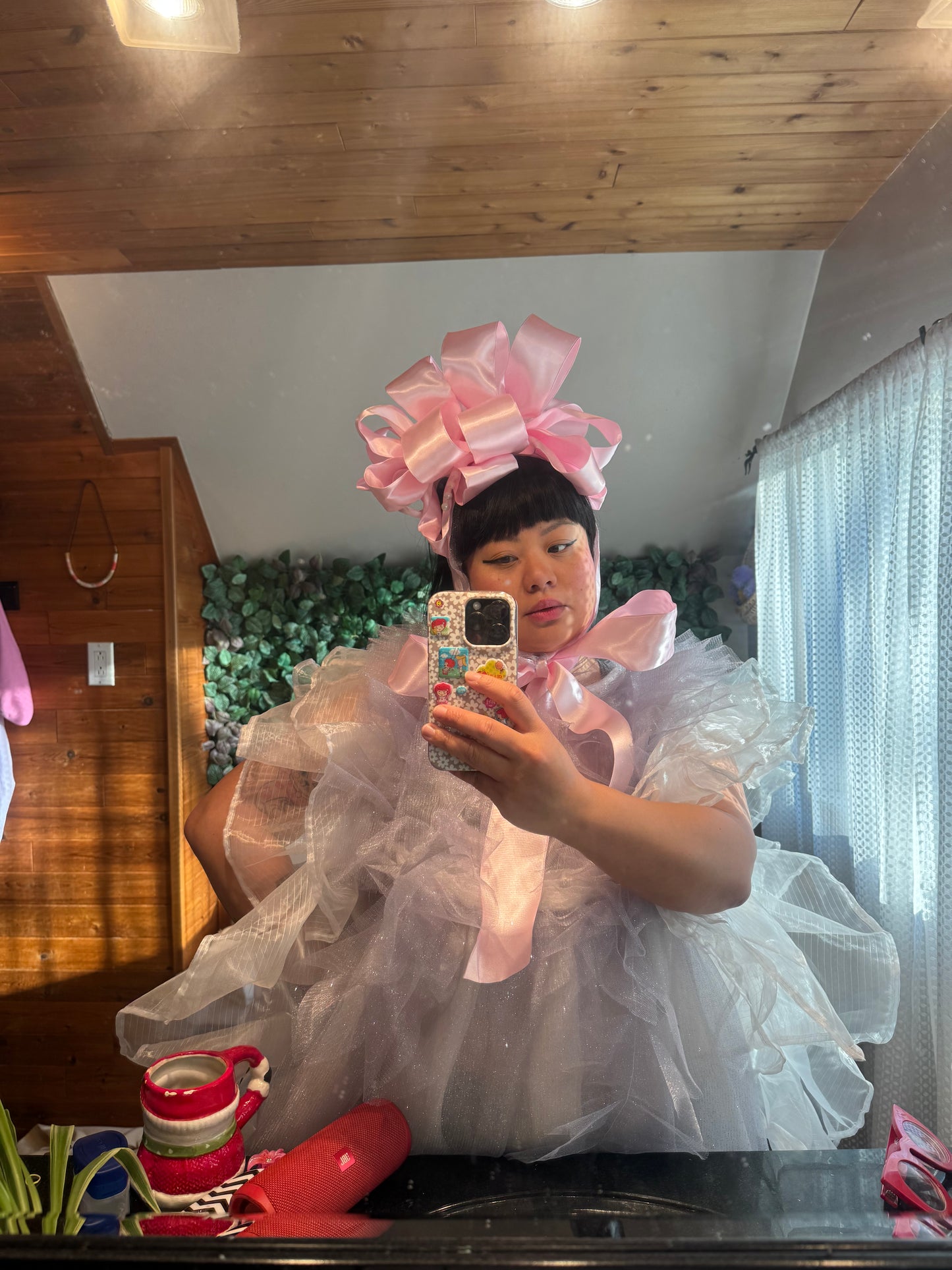 Fable, a cloud of organza with sparkly grey tulle ruffles and little handstitched pearl dingle danglies 😭🥹, she is a whimsical fairy.