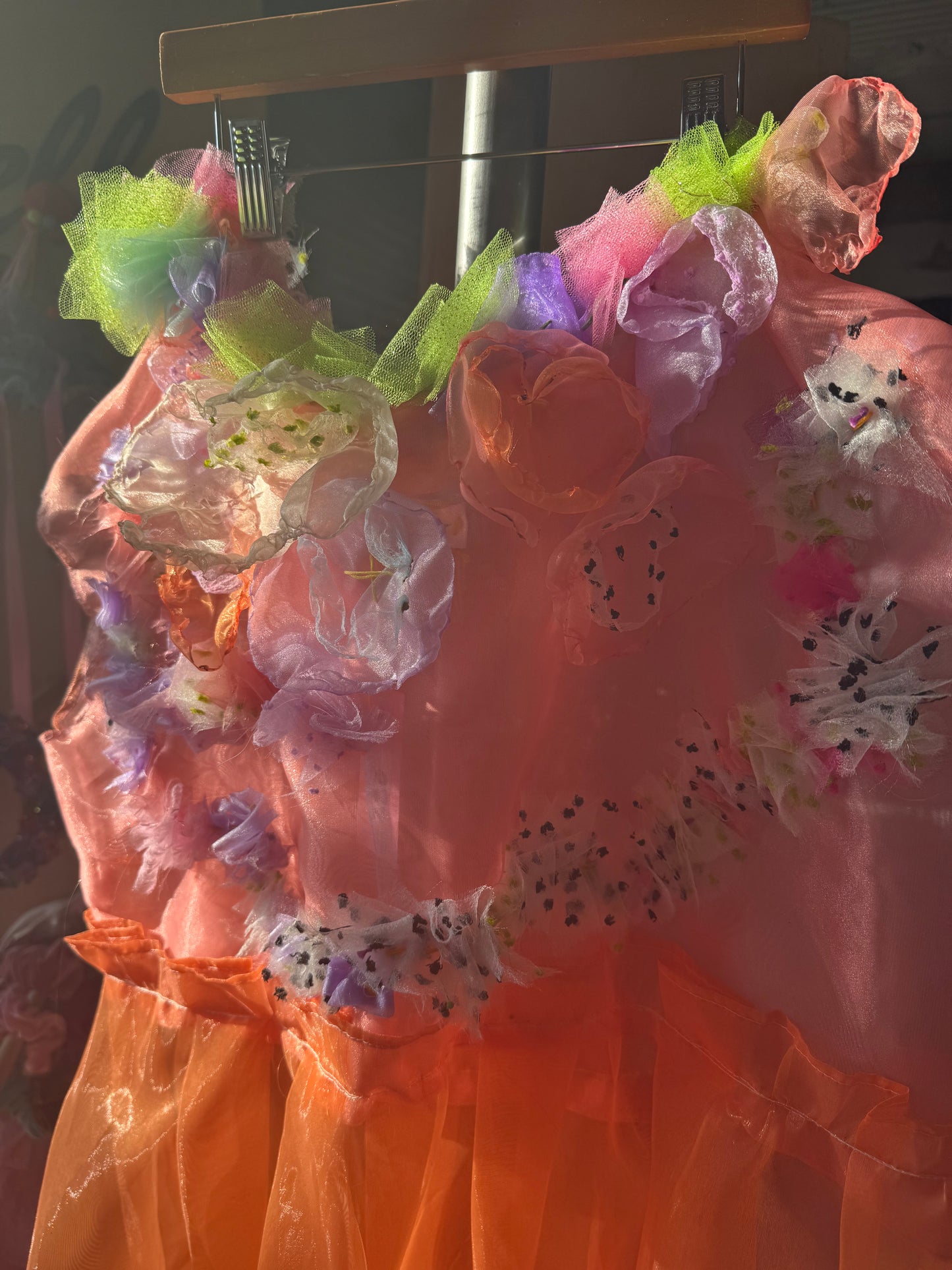 Hand made ruffle detailing made from clippings of other dresses and burned floral organza flowers!